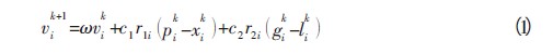 粒子群算法是一種群體智能算法。該算法的基本思想源于鳥類群體飛行覓食的行為。PSO算法通過個(gè)體之間的協(xié)作與競(jìng)爭(zhēng),實(shí)現(xiàn)復(fù)雜空間中最優(yōu)解的搜索。而且PSO算法效率較高,也易于實(shí)現(xiàn),在工程實(shí)踐中應(yīng)用范圍也越來越廣泛。PSO算法的基本過程包括:初始化、粒子飛行和結(jié)果確定。算法首先隨機(jī)生成初始種群,其中包含若干數(shù)量的粒子,這些粒子將在可行域內(nèi)運(yùn)動(dòng)。通過計(jì)算每一個(gè)粒子的適應(yīng)值,從而獲得粒子新的運(yùn)動(dòng)方向和運(yùn)動(dòng)速度。一般情況下,在粒子每一輪運(yùn)動(dòng)過程中,最優(yōu)粒子以及歷史最優(yōu)粒子對(duì)粒子下一輪運(yùn)動(dòng)有較大的影響。最后,經(jīng)過多次迭代計(jì)算之后,獲得最優(yōu)解。Shi和Eberhart 在早期PSO算法基礎(chǔ)上通過引入慣性權(quán)重,較好地改善了PSO算法的收斂性能,其粒子的進(jìn)化方程為: