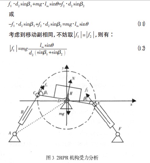 選取桿CE為分析對(duì)象,假定載荷的質(zhì)量是m,其質(zhì)心距離轉(zhuǎn)動(dòng)副D的距離為1m,不妨取1m,d2。桿CE的受力情況,如圖3所示。其中,角度β1 和β2 分別為力f1、f2 與桿CE之間的夾角。桿CE與X 軸的夾角設(shè)定為θ。在力平衡狀態(tài)下,向D點(diǎn)取矩,力矩之和為0,即有:ΣMD=0,具體表示為: