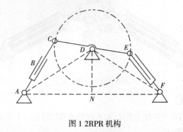 項(xiàng)目對(duì)鉸鏈的要求是:載重量3t、輸出轉(zhuǎn)角為±90°,尺寸不 超過(2000×500×1000)mm。根據(jù)上述要求,選擇2rpr機(jī)構(gòu)作為鉸鏈機(jī)構(gòu),如圖1 所示。機(jī)構(gòu)的主要特點(diǎn)是: