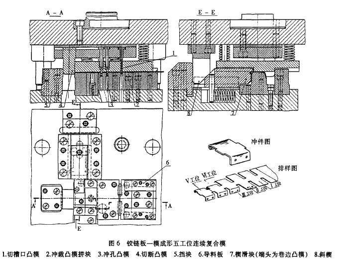 上面已提過(guò)圖6所示鉸鏈板沖件圖、排樣圖及其 五工位連續(xù)復(fù)合模的結(jié)構(gòu)。該沖件與圖4鉸鏈板零件 略有不同,因?yàn)檎归_(kāi)寬度僅50ram,所以采用標(biāo)準(zhǔn)卷材 配通用輥式送料裝置進(jìn)行連續(xù)大量生產(chǎn)。該沖模的主 要結(jié)構(gòu)特點(diǎn)如下: