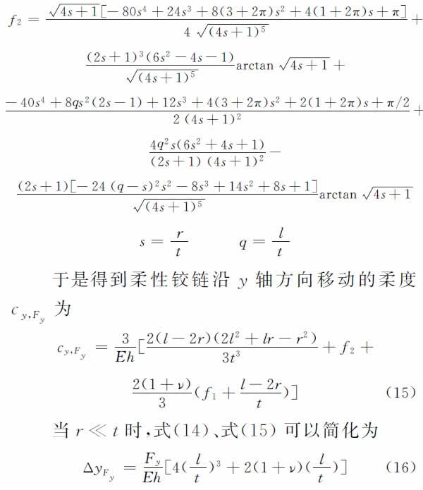 柔性鉸鏈利用其自身的彈性變形而非剛性元件的運動來傳遞或轉換運動、力或能量,相對于傳統(tǒng)運動鉸鏈,柔性鉸鏈具有運動分辨率高、無摩擦、無需潤滑、制造工藝簡單等優(yōu)點,已被廣泛應用于投影光刻物鏡、硅片工作臺、電子掃描顯微鏡、空間光學遙感器[7飊8]等精密器件,以及精密和超精密加工等領域。柔性鉸鏈的柔度是柔性鉸鏈、柔順機構的關鍵參數,直接關系到柔順機構的動態(tài)特性及其末端的定位精度。國內外圍繞柔性鉸鏈的柔度開展了很多研究工作。Paros等推導了單軸和雙軸圓弧形柔性鉸鏈柔度的精確計算公式以及簡化公式。吳鷹飛等給出了圓弧形柔性鉸鏈柔度更為簡潔的計算方法。Smith等給出了橢圓形柔性鉸鏈的柔度矩陣計算方法,并通過有限元和實驗的方法進行了驗證。Lobontiu等[14]基于卡氏第二定理建立了直梁圓角形柔性鉸鏈柔度的理論模型,并將其應用到平面運動放大機構中,但該理論模型沒有考慮剪切力的影響。Hale[15]對直梁圓角形柔性鉸鏈進行了分析,建立了其柔度矩陣的計算模型,但模型僅考慮了柔度矩陣對角線的元素。Xu等通過有限元方法對圓弧形、直梁圓角形和橢圓形柔性鉸鏈的運動精度進行了分析。