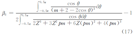 對p=(-0.3,0.3)范圍內(nèi)的誤差β3進行數(shù)值積分和曲線擬合,得到不同m 參數(shù)值下,軸心線垂直度誤差系數(shù)p 引起的剛度誤差β3(p)為