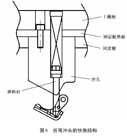 模具在工作過程中會使部分零部件磨損較嚴(yán)重,如二序成形模中的折彎沖頭(圖6),在模具設(shè)計時,通常將其原來的掛臺固定方式改換成螺紋固定,使后期在不拆卸模板的情況下實現(xiàn)沖頭的拆卸和更換。此外,由于前門兩側(cè)的鉸鏈車身件具有對稱結(jié)構(gòu),在落料模具設(shè)計時凸凹模設(shè)計成易更換的鑲塊結(jié)構(gòu),在增加耐用性、易換性的同時,可以通過更換相應(yīng)的凸凹模鑲塊加工左右門鉸鏈的車身件,使左右對稱的鉸鏈車身件共用一套落料模具,從而減少了模具開發(fā)成本及模具加工過程中的能耗,節(jié)約了模具材料資源。