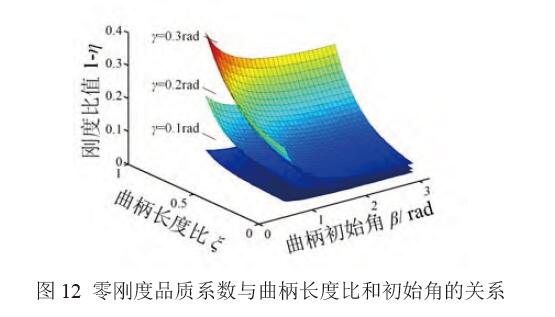 η 越接近100%,零剛度品質(zhì)越高。圖12為1-η 與 曲柄長度比ξ 和初始角β 的關(guān)系。η 與曲柄彈簧機(jī)構(gòu)并聯(lián)數(shù)n以及基座長度l 無關(guān),僅與曲柄長度比ξ、轉(zhuǎn)角γ 以及初始角β 相關(guān)。