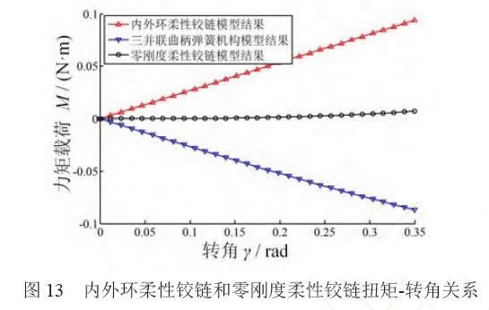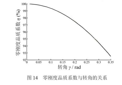 (2) 通過匹配正負(fù)剛度,得到曲柄彈簧機(jī)構(gòu)中 的彈簧的剛度特性(式(16)),建立模型(式(19))分析 了曲柄彈簧機(jī)構(gòu)結(jié)構(gòu)參數(shù)對零剛度柔性鉸鏈零剛度 品質(zhì)的影響,理論上,在內(nèi)外環(huán)柔性鉸鏈的可用行 程內(nèi)(±20°),剛度平均降低幅度可達(dá)97%。