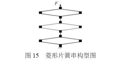 傳統(tǒng)壓簧的剛度和尺寸難以精確定制,且應(yīng)用時多需要導(dǎo)向機(jī)構(gòu)。因此,提出一種剛度和尺寸可 以定制的彈簧——菱形片簧串。菱形片簧串(圖15) 由多個菱形片簧串聯(lián)構(gòu)成,具有結(jié)構(gòu)設(shè)計自由,定 制度高等特性,其加工工藝與柔性鉸鏈一致,均采 用精密線切割加工。