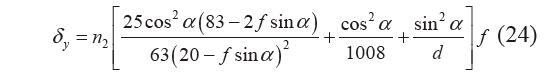 由菱形片簧的對稱性,只需對一根簧片進(jìn)行受 力分析,如圖16所示。 α 為簧片與水平之間的夾角,簧片的長寬厚分別為Ld、Wd、Td,f 為菱形片 簧所受的量綱一化載荷,δy 為菱形片簧在y 方向的 變形量,力fy 和力矩m 為等效在單個簧片末端上的載荷,fv 和fw 為fy 在wov 坐標(biāo)系下的分力。