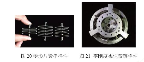 內(nèi)外環(huán)柔性鉸鏈和菱形片簧串均采用精密線切 割機(jī)床加工,內(nèi)外環(huán)柔性鉸鏈采用分層加工并裝配而成,圖20為三組菱形片簧串實物圖,圖21為裝 配完成的零剛度柔性鉸鏈樣件實物圖。