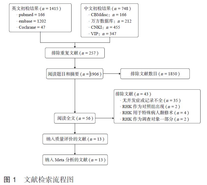 中文文獻檢索數(shù)據(jù)庫包括中國生物醫(yī)學文獻數(shù)據(jù)庫(CBMdisc)、中國期刊全文數(shù)據(jù)庫(CNKI)、萬方數(shù)據(jù)庫;英文文獻數(shù)據(jù)庫包括PubMed、荷蘭醫(yī)學文摘數(shù)據(jù)庫 ( EMBASE )、the cochrane library;其它檢索方式有已選文獻的手工檢索。各數(shù)據(jù)庫的檢索時間為2001年1月至 2017年12月。英文檢索詞為 knee arthroplasty or arthroplasty、knee prosthesis、 postoperative complications。中文檢索詞為膝關(guān)節(jié)置換術(shù)或成形術(shù)、膝關(guān)節(jié)假體、術(shù)后并發(fā)癥。