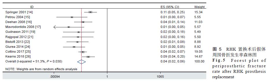 4.假體周圍骨折發(fā)生率:納入的10篇文獻,總例數(shù)1213例,假體周圍骨折40例。進行Meta分析,異質(zhì)性檢驗結(jié)果I2=51.3%,因此采用隨機效應模型,結(jié)果顯示:RHK術(shù)后假體周圍骨折發(fā)生率為0.04,95%可信區(qū)間估計值(0.02,0.06)(圖5)。轉(zhuǎn)化后結(jié)果為3.8%(95%CI:2.0%~5.7%)。